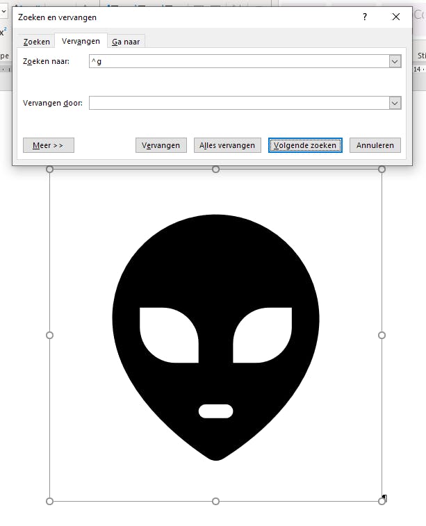 De eerste manier is de meest drastische oplossing, waarbij je aan Word vraagt alle plaatjes te verwijderen met de functie Zoeken en vervangen. Daarvoor gebruik je in het tabblad Start bij de groep Bewerken de knop Vervangen. In het vak Zoeken naar typ je ^g en laat je het vak Vervangen leeg. Test dit even, zodat je zeker weet dat de truc werkt door op de knop Volgende zoeken te klikken. Als je merkt dat Word telkens van afbeelding naar afbeelding springt wanneer je op deze knop klikt, dan kun je met een gerust hart op de knop Alles vervangen klikken. Deze truc verwijdert alle grafische elementen in het document. Als je wilt, kun je met Bestand / Opslaan als een versie zonder afbeeldingen opslaan.