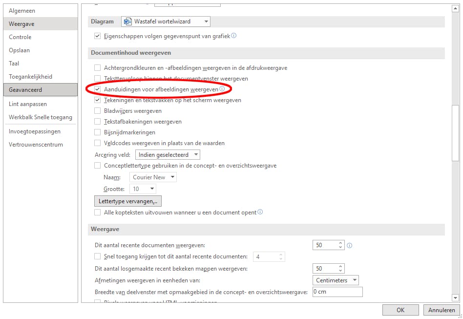 Is vorige stap te ingrijpend, want je verwijdert per slot van rekening alle plaatjes, dan kun je ook alle afbeeldingen in het document behouden, zonder dat je ze te zien krijgt. Hiervoor ga je via Bestand naar Opties. Kies de rubriek Geavanceerd aan de linkerkant en scrol dan rechts naar beneden, tot je bij het onderdeel Documentinhoud weergeven komt. Vink hier de optie Aanduidingen voor afbeeldingen weergeven aan. Hierdoor worden de afbeeldingen vervangen door lege vlakken die de grootte van iedere afbeelding aanduiden, maar niet de inhoud.