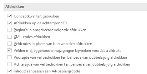 Misschien wil je de afbeeldingen wel op het scherm zien, maar wil je er geen inkt aan verspillen. Er is een aantal manieren om dit te doen, maar de volgende manier lijkt ons de makkelijkste. Ga via Bestand naar de Opties en kies in de linkerkolom de rubriek Geavanceerd. Aan de rechterkant ga je naar de rubriek Afdrukken en daar zet je een vinkje bij Conceptkwaliteit gebruiken. In de conceptmodus zal Word het document niet alleen veel sneller door de printer jagen, maar verschijnen er ook lege vakken op de plaatsen van de afbeeldingen. Dit is een alles-of-niets oplossing. Als je bepaalde afbeeldingen in het document wilt weergeven en andere niet, dan zal deze oplossing niet werken.