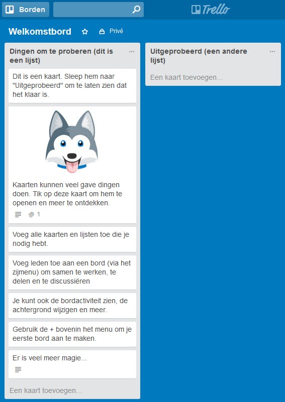 De werking van Trello is gebaseerd op het systeem van de zogenaamde Kanban-borden, een Japanse organisatiemethode om met lijsten en kaarten de workflow te visualiseren. Ook Trello heeft een dashboard waarop je verschillende borden plaatst. Ieder bord staat voor een project. Klik alvast op het Welkomstbord om de inhoud te bekijken. Een bord bestaat uit kaarten, die je trouwens van het ene bord naar het andere kunt slepen. Op die manier bouw je een project op met kaarten waarop de verschillende deeltaken staan. De kaarten in het Welkomstbord staan alvast vol met nuttige tips over het programma.