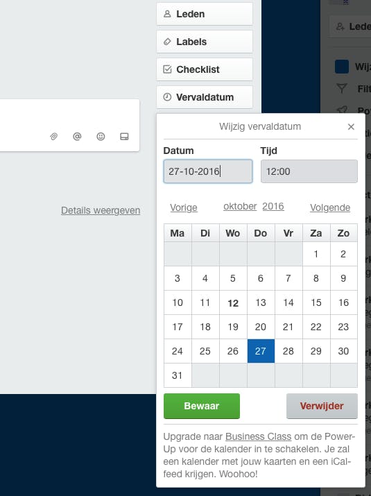 Iedere kaart die je toevoegt, geef je een eigen naam. Klik nog een keer op de kaart zodat het detailfiche verschijnt. In Trello noemen ze het detailvenster ‘de achterkant’ van de kaart. In dit fiche is onder meer ruimte voor een beschrijving. Bovendien is het mogelijk bijlagen toe te voegen vanaf de harde schijf of vanaf de gebruikelijke online opslagplaatsen (Google Drive, Dropbox, Box, OneDrive). Om een deadline toe te voegen klik je op de knop Vervaldatum zodat je in een minikalender een datum kunt selecteren. Wanneer je alle kaarten hebt toegevoegd, maak je een tweede ronde. Sommige gebruikers slepen de kaarten in chronologische orde, andere houden ervan om de kaarten met de hoogste prioriteit bovenaan te plaatsen.