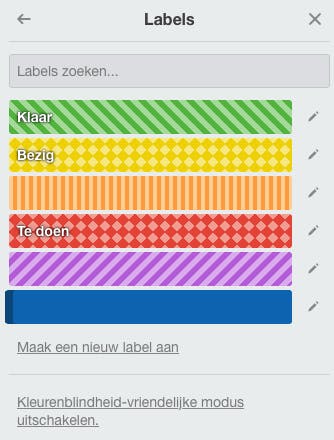 In het menu aan de rechterkant onder de knop Meer zit de functie Labels. Ben je visueel ingesteld dan kun je bepaalde opdrachten in het oog laten springen door ze van een kleur te voorzien. In de praktijk gebruikt men deze labels vaak om de status van taken bij te houden. Zo kun je groen bijvoorbeeld gebruiken voor Klaar, geel voor Bezig en rood voor Te doen. Of je geeft ieder gezinslid zijn eigen label. Iedere kleur kun je een andere benaming geven en het is mogelijk om nieuwe labels en dus nieuwe kleurtjes aan te maken. Onderaan de kleuren staat de knop om de weergave voor kleurenblindheid in te schakelen. Hierdoor plaatst Trello een patroon over de kleuren. Een ander voordeel van labels is dat je de zoekopdracht kunt instellen op labels.