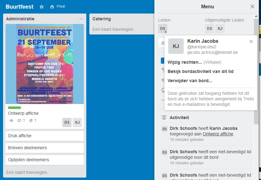Aanvankelijk is het menu nog verborgen. Door rechts op de knop Laat menu zien te klikken komt deze menukolom in beeld. In het vak Leden toevoegen vul je de e-mailadressen in van degenen die aan het project meewerken. Deze personen zullen via mail een uitnodiging ontvangen om mee te werken aan het project. De initialen en eventueel de afbeelding van het lid verschijnen dan in het menu bij Uitgenodigde leden. Om dit lid met anderen te laten samenwerken aan hetzelfde bord, selecteer je het blokje met de initialen van dit lid en je sleept het op het bord. Je kunt een teamlid ook op een volledige lijst of op individuele kaarten slepen.