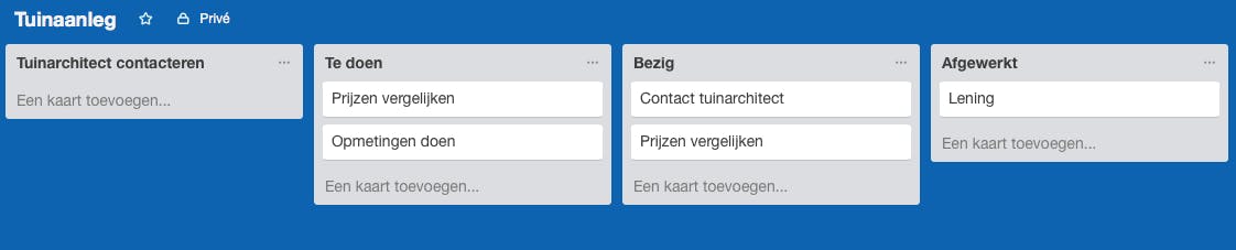 Het is handig om op een bord een lijst Te doen, een lijst Bezig en een lijst Afgewerkt te plaatsen. Op die manier kun je, wanneer je aan een nieuwe deeltaak begint, de kaart van Te doen naar Bezig slepen. Van links naar rechts. Is de opdracht klaar, dan gaat hij naar de volgende lijst: Afgewerkt. Zo krijgt iedereen binnen het team zicht op de progressie van ieder lid en de groep.