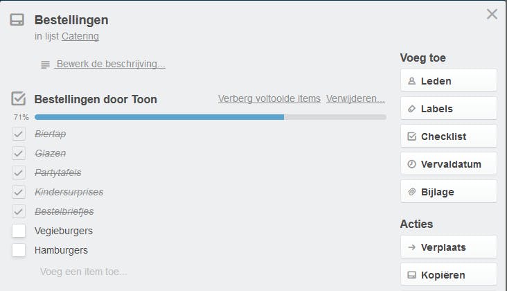 Om niets aan het toeval over te laten, wil je waarschijnlijk met afstiplijsten werken. Klik daarvoor op de opdrachtkaart die voorzien moet worden van dit soort geheugensteuntjes en selecteer in het detailfiche het item Checklist. Je geeft de checklist een naam. Vanaf dan kun je items toevoegen aan de lijst via de knop Voeg toe. Om dat proces extra te versnellen, druk je telkens de Enter-toets in. Achteraf vink je in de Checklist de items af die in orde zijn. Gaat het bijvoorbeeld om een boodschappenlijstje, gebruik dan de Trello-app op je smartphone om het een na het andere item tussentijds af te stippen. De overige leden van het team zien hoe jij alle items hebt aangeschaft. Bovenaan verschijnt er zelfs een balk met percentages die aangeven wat jij van de checklist hebt afgewerkt en wat je team heeft gedaan.