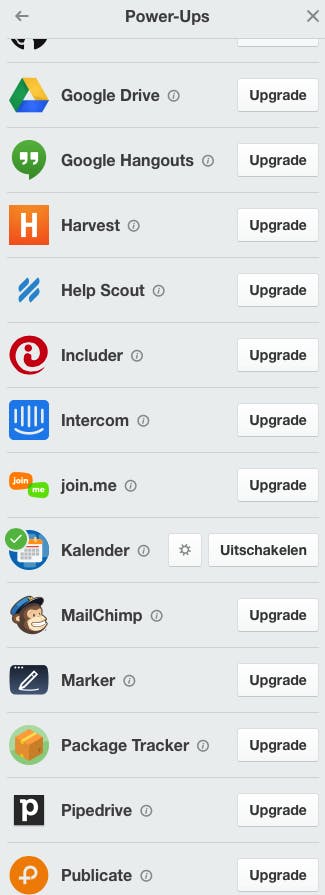 Een interessante optie van Trello zijn de zogenaamde Power-ups. Het gaat om uitbreidingen die de mogelijkheden van deze projectmanager stevig uitbreiden. Je vindt de Power-ups in de Menu-kolom.