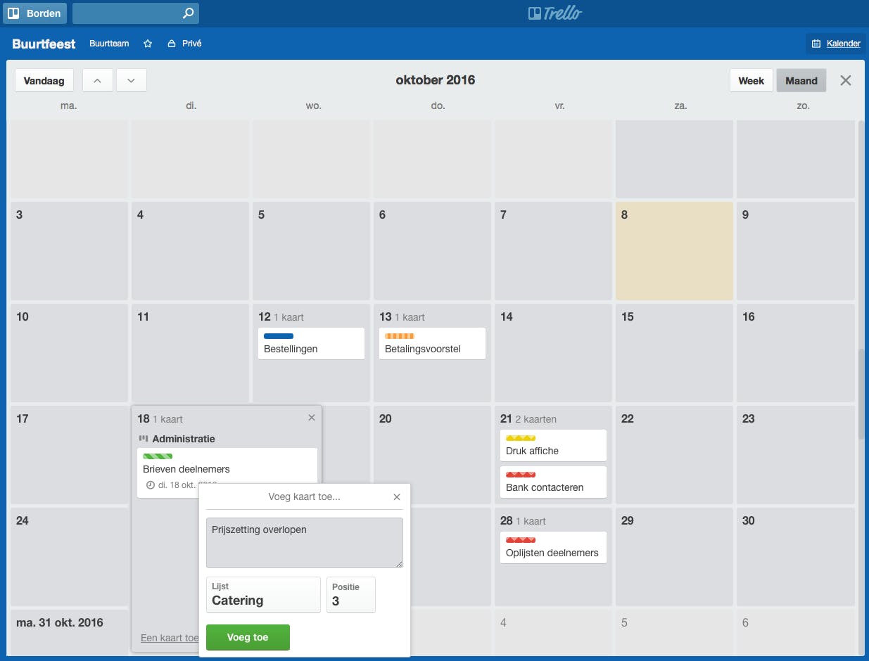 Een van de handigste Power-ups is Kalender. Activeer die om in de blauwe balk bovenaan een nieuwe knop te zien: Kalender. Met deze knop opent een venstervullende kalender die je op week- en maandweergave kunt instellen. Je zult merken dat in de kalender automatisch alle kaarten zijn opgenomen waarbij een bepaalde vervaldag op het infofiche staat. Bovendien kun je in de kalendermodule rechtstreeks kaarten toevoegen door op een datum te dubbelklikken. In het minivenster geef je dan de lijst op waar deze kaart moet komen en je bepaalt numeriek welke positie die kaart krijgt.