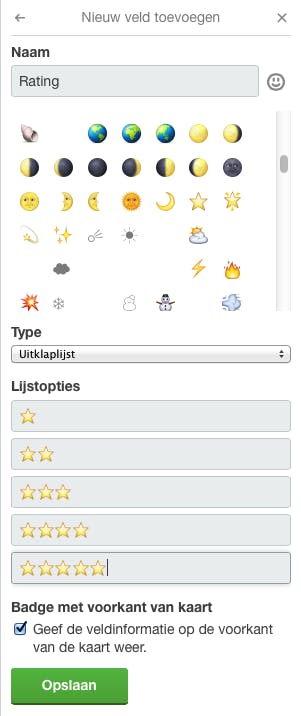 Geef het nieuwe veld een naam, bijvoorbeeld Rating. Bij Type kies je uit het keuzemenu de optie Uitklaplijst en in het vak Lijstopties plaats je een ster, in het volgende vak twee sterren, en zo verder. Die sterren haal je uit de knop Emoji.