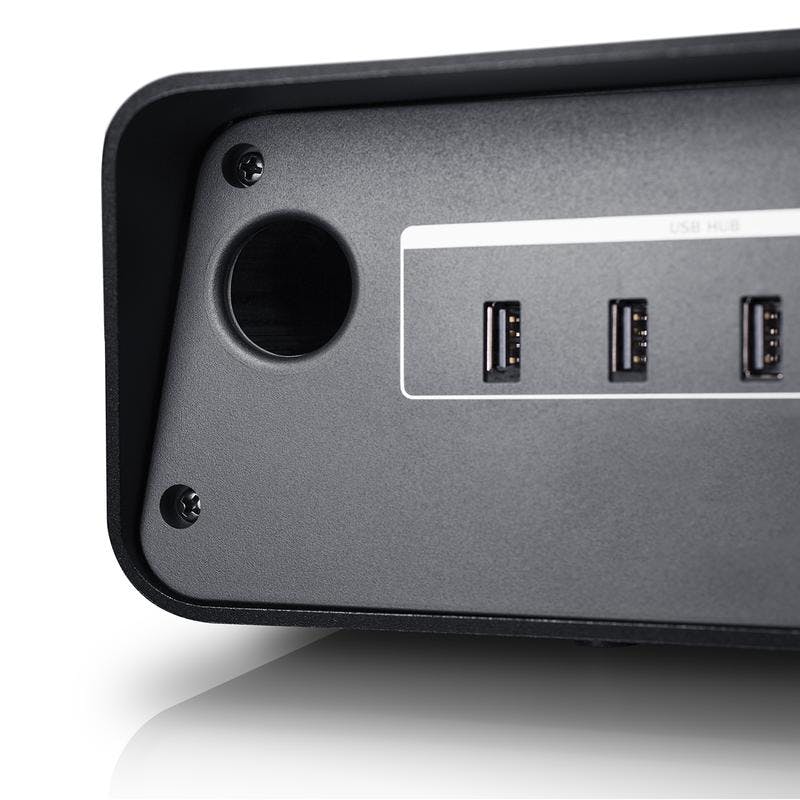 De USB-aansluiting heeft nog een voordeel. De Mediadeck dient tegelijkertijd als USB-hub. De speaker voorziet je desktop of laptop met maar liefst drie extra USB-ingangen, welke je op de achterzijde van de speaker vindt. Daarnaast is er een extra vierde USB-ingang, welke je kan gebruiken om smartphone en andere hardware op te laden.