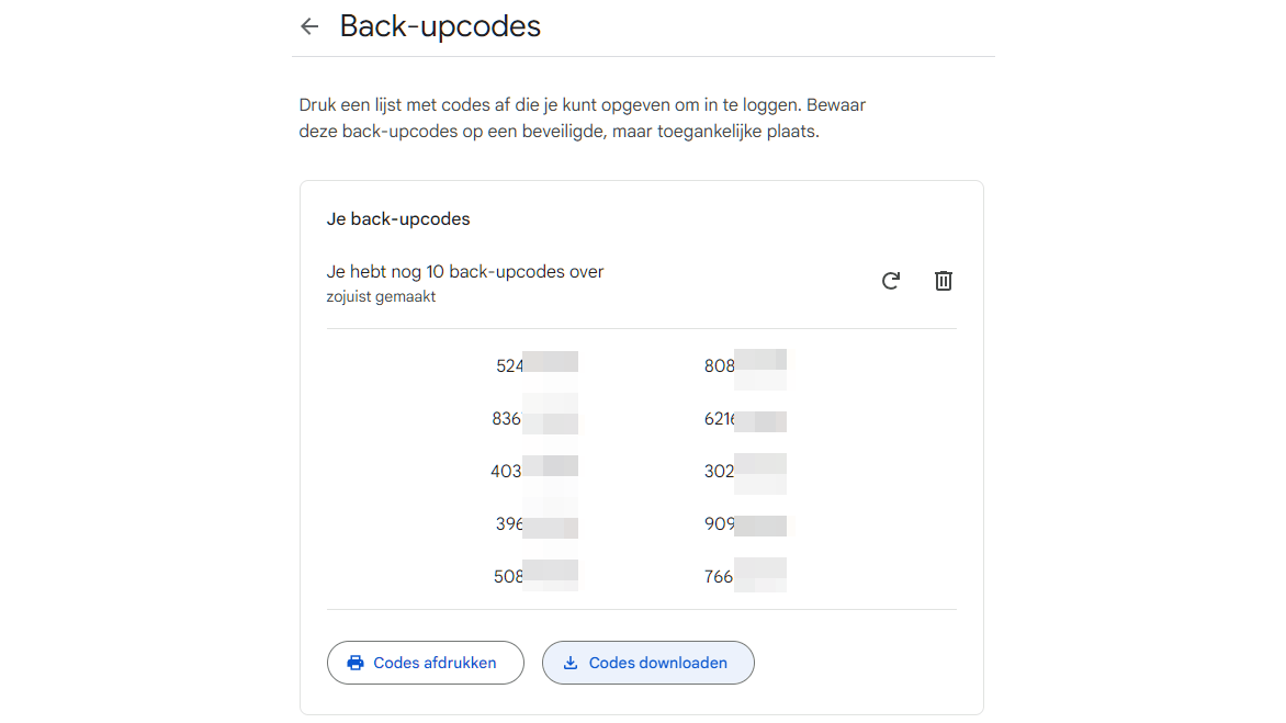 Je doet er goed aan meteen je back-upcodes op te vragen en veilig te bewaren.
