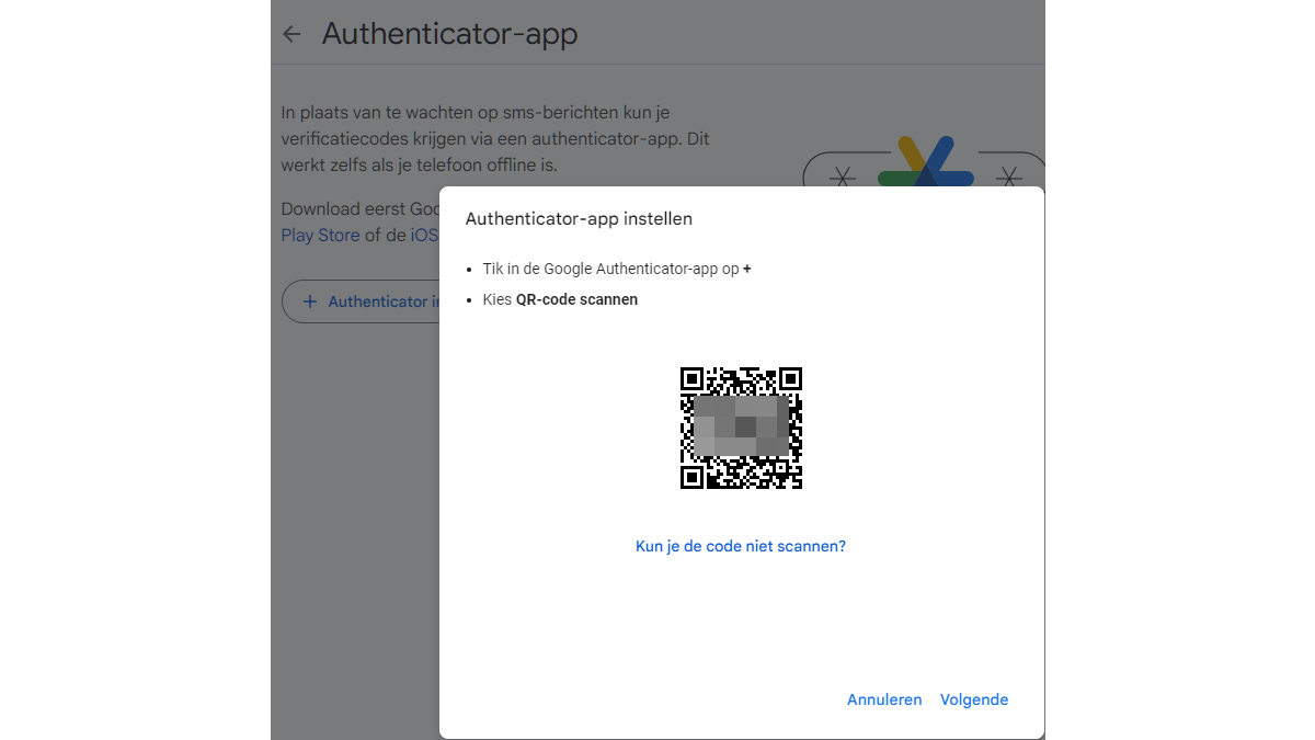 Open de appstore op je iPhone of Android en installeer Google Authenticator. Ga op de Google-site bij Tweestapsverificatie naar Authenticator-app toevoegen en klik op Authenticator instellen. Open de app op je smartphone, tik op de plusknop, kies QR-code scannen en richt je camera op de QR-code op de site. Of kies Instelsleutel invoeren, klik op de site op Kun je de code niet scannen en vul handmatig de 32 tekens in. Druk op Volgende en vul de 6 codecijfers van het TOTP in dat inmiddels in de app te zien is en automatisch wordt vernieuwd. Bevestig met Verifiëren. Je kunt deze code voortaan ook gebruiken bij het inloggen.
