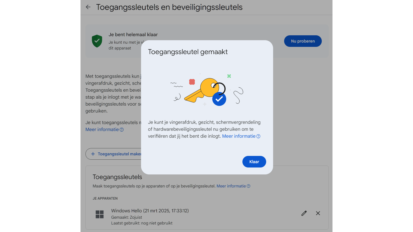 Je krijgt normaliter meteen de optie Toegangssleutel maken. Na bevestiging via Windows Hello en een klik op Klaar zie je dat je toegangssleutel is toegevoegd. Voortaan kun je via Windows Hello verifiëren dat jij bij Google inlogt. Klik gerust eens op Nu proberen. Je hoeft zelfs je wachtwoord niet meer in te vullen, omdat dit werkt als client-side MFA (zie tekstkader ‘Wachtwoordloos’).