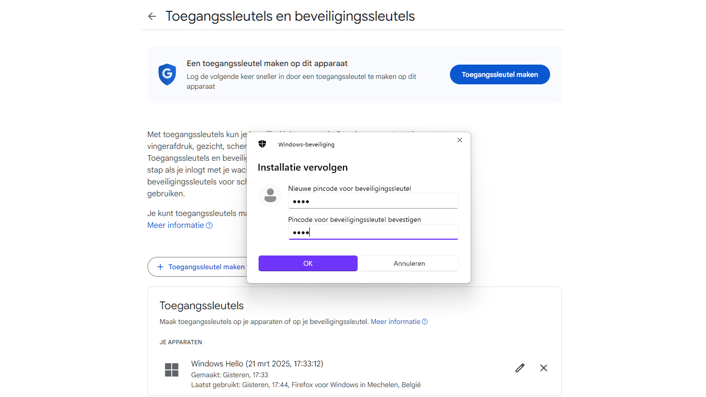 - Maak een toegangssleutel aan via Windows Hello