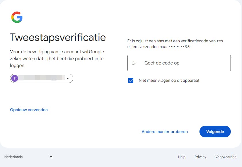Bij Google kan dit een Google-prompt zijn: je krijgt een pop-upmelding op een vertrouwd Android- of iOS-apparaat om de inlogpoging te bevestigen. Ook mogelijk is een tijdelijke TOTP-code (Time-based One-Time Password) die je invoert via een authenticator-app als Google Authenticator. Een andere optie is een sms of spraakoproep met een cijfercode.