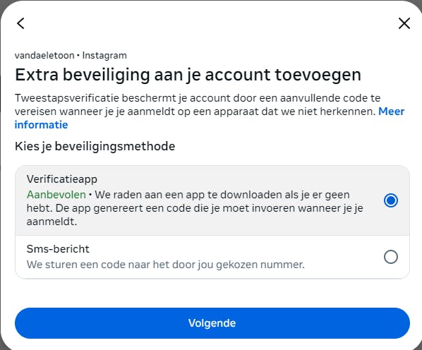 Standaard zie je twee opties: Verificatieapp (authenticator) en Sms-bericht. De aanbevolen methode is de verificatie-app. Selecteer deze en klik op Volgende. Je ziet nu een QR-code en de bijbehorende veiligheidscode. Scan de QR-code met je authenticator-app of voer de code handmatig in. Het TOTP wordt toegevoegd. Klik op Volgende en vul het actuele TOTP in. Je krijgt een bevestiging dat tweestapsverificatie actief is. Je kunt nu ook je lijst met back-upcodes bekijken en downloaden. Rond af met Klaar.