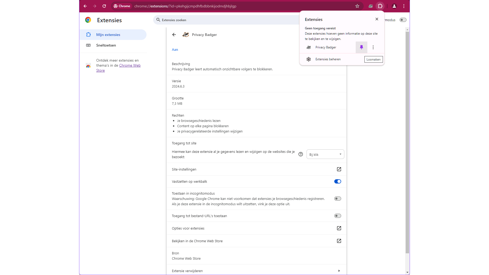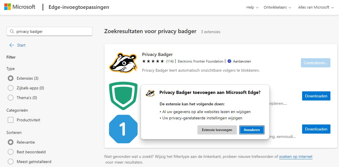 Zowel bij Microsoft als Google zijn de extensies overzichtelijk gecategoriseerd. Via de zoekbalk kun je ook op naam zoeken. We nemen als voorbeeld Privacy Badger (daarover straks meer), maar ook alle overige hier besproken extensies vind je in de officiële webstores. Druk op de knop Downloaden (Edge) of Toev. aan Chrome en bevestig met Extensie toevoegen. Even later is de extensie geïnstalleerd en vind je deze in het overzicht terug.
