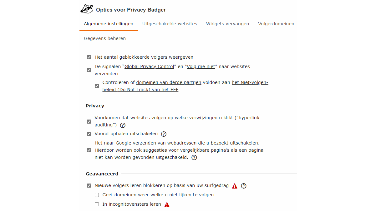 De eerste privacy-browserextensie die we toelichten is Privacy Badger. Je weet inmiddels waar je deze kunt vinden en hoe je de extensie activeert en beheert. Privacy Badger is ontwikkeld door de Electronic Frontier Foundation (EFF) en blokkeert allerlei traceermechanismen, ongeacht of ze advertenties tonen. Hoewel je weinig omkijken hebt naar deze extensie, is het toch nuttig de extensie-opties op de vier tabbladen te bekijken. We beperken ons hier tot de interessantste opties die je mogelijk wilt aanpassen.