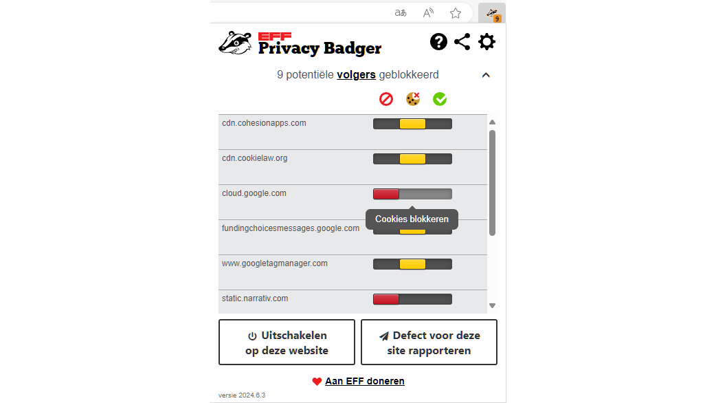 Wanneer je een site bezoekt, geeft Privacy Badger standaard het aantal gedetecteerde en geblokkeerde trackers aan via een teller in de knop. Klik hierop om te weten welke sites achter deze trackers zitten. Ook van hieruit kun je deze instellen op rood, geel of groen.