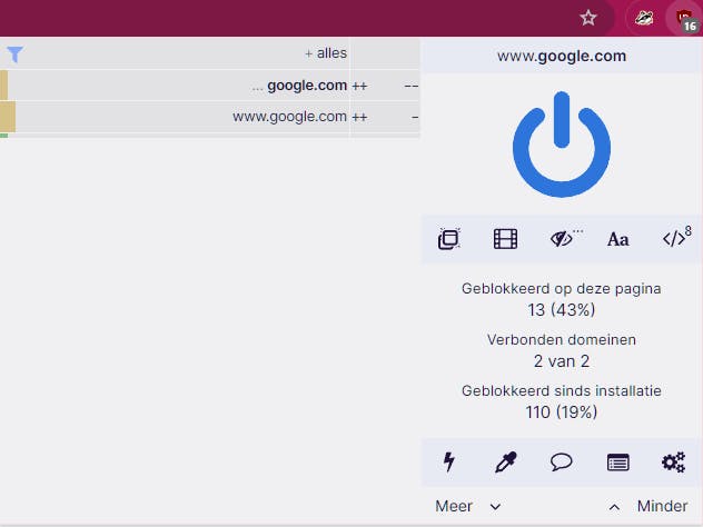 Bij een sitebezoek geeft een teller aan hoeveel trackers op de pagina zijn gedetecteerd. Klik hierop voor een pop-upvenster met meer informatie en opties. Druk op de blauwe knop als je uBlock voor de betreffende website wilt uitschakelen. Houd de Ctrl-toets ingedrukt als je dit alleen voor die webpagina wilt doen. Klik op het bliksemicoon om tijdelijk specifieke elementen te verwijderen die storende inhoud bevatten. Via het pipetje kun je zelfs eigen regels definiëren om specifieke elementen permanent te blokkeren, maar dit is behoorlijk geavanceerd. Wanneer je (eventueel meerdere keren) op Meer klikt, verschijnen er extra knoppen om onder meer pop-ups, grote media-elementen, externe lettertypen en JavaScript op die website te blokkeren.
