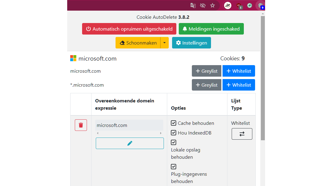 Telkens wanneer je een webpagina bezoekt, geeft een teller het aantal gedetecteerde cookies aan. Klik hierop om cookies voor deze website of het domein toe te laten (+Whitelist) of bij het afsluiten van de browser te wissen (+Greylist). Via het pijlknopje bij Schoonmaken kun je onderdelen zoals cache en cookies voor het betreffende domein opschonen. Automatisch opruimen staat standaard uitgeschakeld, maar dit kun je eenvoudig inschakelen. Dit zorgt ervoor dat cookies na een instelbare tijd (standaard vijftien seconden) worden verwijderd wanneer je het tabblad sluit. Via Instellingen kun je de tijd aanpassen. Activeer Opschonen inschakelen bij domeinwijziging om cookies van het vorige domein te verwijderen wanneer je op hetzelfde tabblad naar een ander domein surft. Bekijk ook zeker de andere opties. Klik op een vraagteken voor extra informatie.