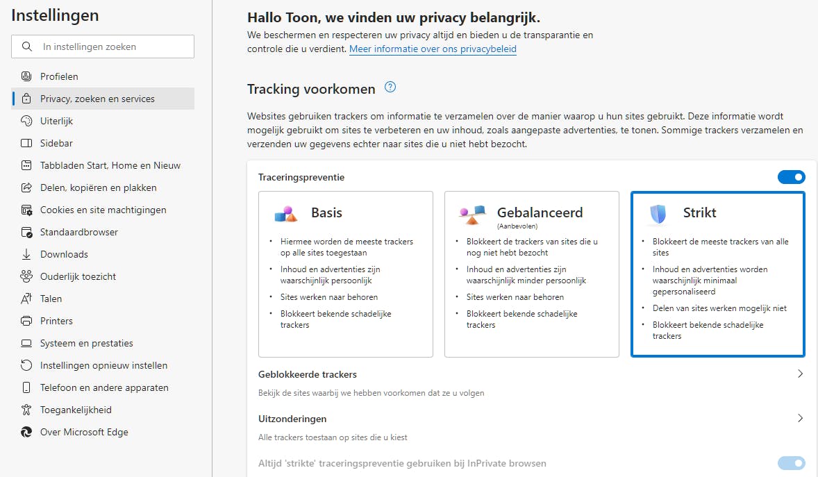 Browserinstellingen Het installeren van browserextensies betekent niet dat je de ingebouwde privacy-opties van je browser mag negeren. Het instellen van je browser hoort zelfs de eerste stap te zijn. Voor privacy open je bij Chrome Instellingen / Privacy en beveiliging, en bij Edge Instellingen / Privacy, zoeken en services. Hoewel het te ver voert om hier alle opties te bespreken, raden we aan alle onderdelen zelf goed door te nemen. Bekijk in Chrome zeker de opties van de Privacygids en stel bij Edge de Traceringspreventie minimaal in op Gebalanceerd, en bij voorkeur zelfs op Strikt. Bij Uitzonderingen kun je zelf sites toevoegen die nog trackers mogen gebruiken.