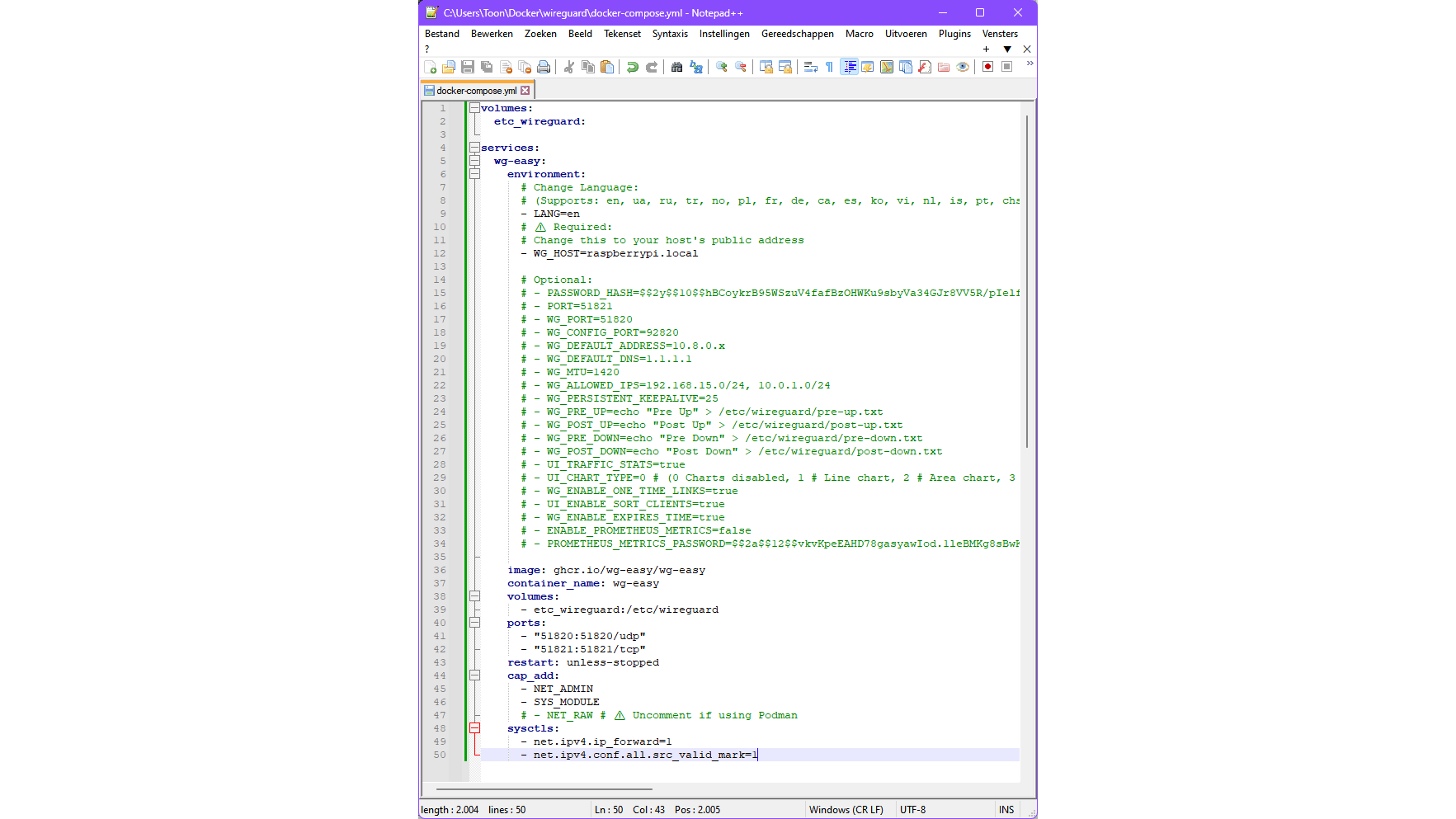 Docker is nu klaar om de WireGuard-container te installeren, starten en beheren. Gebruik hiervoor dit docker-compose.yml-bestand. Scrol op de pagina naar de link docker-compose.yml en druk op het knopje Copy raw file (rechtsboven). Open een teksteditor, zoals Notepad++ of Kladblok. Plak de inhoud met de toetscombinatie Ctrl+V in de editor. Sla dit bestand op als docker-compose.yml in een aparte, eventueel nog te creëren map, bijvoorbeeld C:\Users\<je_gebruikersnaam>\docker\wireguard.