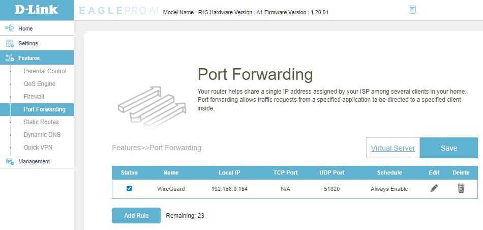 Zo ziet de poortdoorverwijzingsregel eruit op onze eigen router (D-Link EaglePro AI).