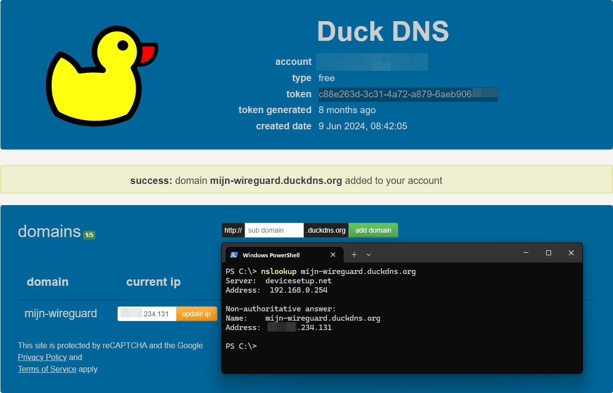 Creëer het gewenste subdomein bij DuckDNS en controleer of dat operationeel is.