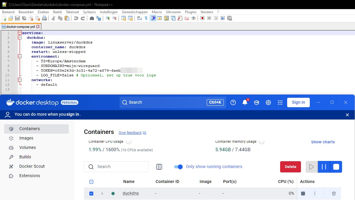 Vervang uiteraard <mijn_subdomein> en <mijn_duckdns_token> door de juiste waarden. Bewaar dit bestand als docker-compose.yml in een aparte map, bijvoorbeeld C:\Users\<je_gebruikersnaam>\docker\duckdns. Voer vervolgens vanuit deze map het commando docker compose up -d uit en controleer in Docker Desktop of de container van Duck DNS draait.