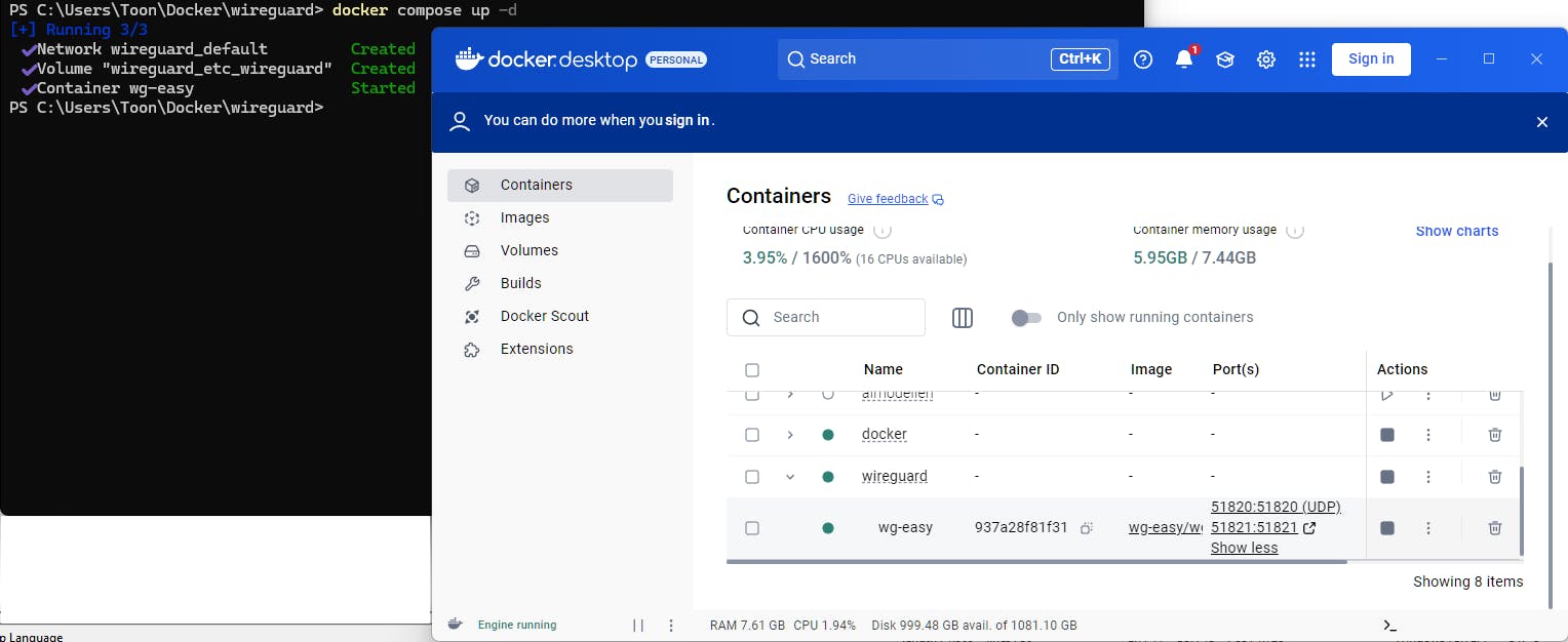 Als Docker meldt dat de Windows Firewall de verbinding blokkeert, klik dan op Toestaan. Kort daarna verschijnt de melding Container wg-easy Started. In Docker Desktop, bij het onderdeel Containers, zie je dat wg-easy actief is en via Show all ports worden de netwerkpoorten weergegeven zoals in het yml-bestand opgenomen. Hier kun je de container ook stoppen, opnieuw starten of desnoods verwijderen.