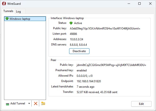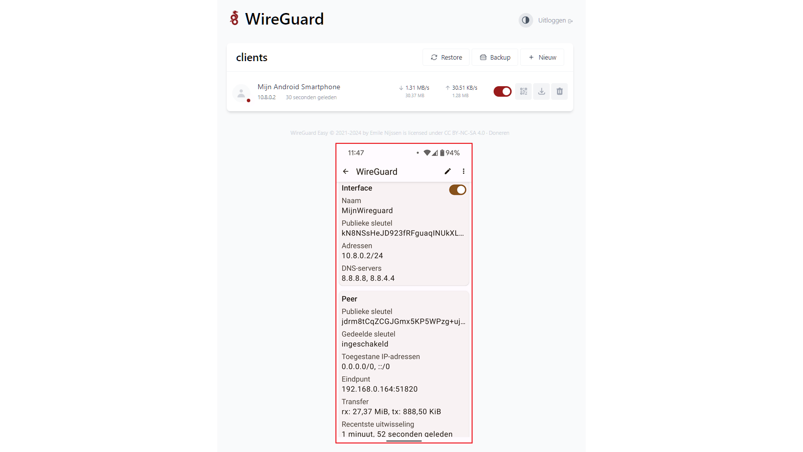 Zodra je de schakelknop bij deze verbinding inschakelt, wordt de VPN-connectie opgezet. Dit herken je vaak aan een sleutelicoontje in de statusbalk. Tik op de naam van de verbinding om details te bekijken zoals de Publieke sleutel, Adressen, ingestelde DNS-servers, het Eindpunt (poort en ip-adres waarop je WireGuard-server luistert) en de Transfer (ontvangen en verzonden data). Dit dataverkeer kun je trouwens ook realtime volgen in het WireGuard-dashboard bij de betreffende client.