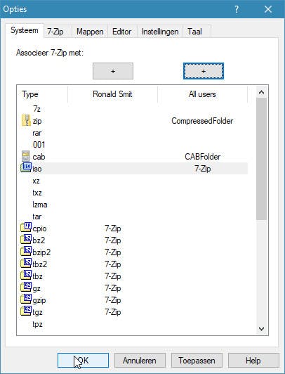 7-Zip download je vanaf hier, er is zowel een 32- als 64-bit versie beschikbaar voor Windows. Op http://www.7-zip.org/download.html vind je bovendien - helemaal onderaan de pagina – tevens wat links naar varianten voor andere besturingssystemen. Wij gaan hier aan de slag met de Windows-versie. Na installatie vind je het programma in het menu Start onder 7-Zip. Om instellingen van het programma te wijzigen moet je het voor deze ene keer als administrator uitvoeren. Klik daarvoor met de rechter muisknop op 7-Zip File Manager en dan onder Meer op Als administrator uitvoeren. We gaan nu eerst alle ondersteunde bestandsformaten aan de tool koppelen. Klik daarvoor in het menu Extra op Opties. In het geopende venster klik je dan op de plusknop boven All users. Overigens zien we hier iets vreemds: als we op de in de lijst getoonde formaten klikken verschijnt daarachter – na klikken – 7-Zip. Wellicht is het verstandig om dus eerst even op de items te klikken en daarna op de plusknop te klikken. Klik dan op OK. Sluit 7-Zip en start het ‘gewoon’ – dus niet als administrator – op.