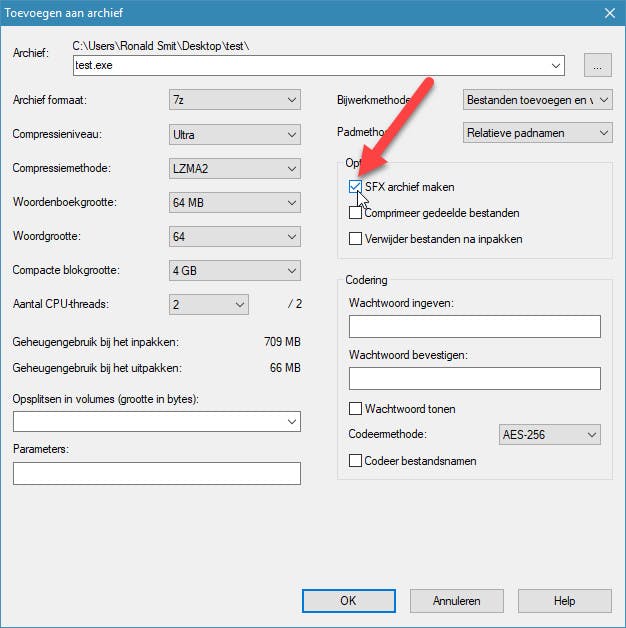 Om een zelfuitpakkend archief te maken klik je weer met de rechter muisknop op een of meer geselecteerde bestanden. Kies dan onder 7-Zip voor Toevoegen aan archief. Kies als Archiefformaat voor 7z en als Compressieniveau weer voor Ultra. Schakel de optie SFX archief maken in. Eventueel kan je een wachtwoord met sterke AES 256-encryptie instellen. Klik op OK. Je krijgt nu een .exe-bestand; door hierop te dubbelklikken kunnen de daarin aanwezige bestanden ook uitgepakt worden. Handig voor iemand die géén 7-Zip heeft geïnstalleerd. Nadeel is dat mailproviders als Gmail het verzenden van .exe-bestanden uit veiligheidsoverwegingen blokkeren. Maar als jouw mailprovider dat niet doet: mooi meegenomen.
