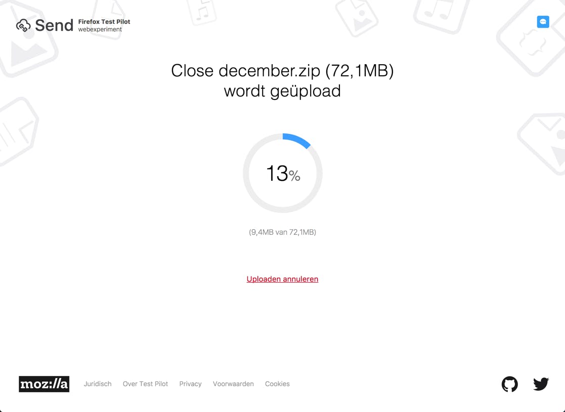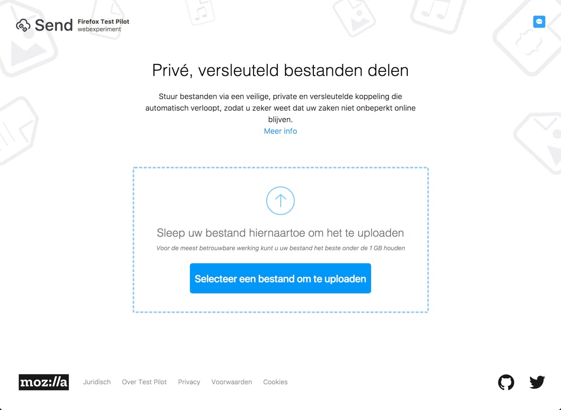 Om Firefox Send te gebruiken, heb je geen account nodig. Je surft – met Firefox of een andere browser – simpelweg naar https://send.firefox.com. Vervolgens kun je de bestanden die je wilt versturen naar het centrale vak slepen. Of je drukt op de knop Selecteer een bestand om te uploaden en bladert naar de juiste bestandslocatie op je computer. Ga in dat geval verder met de knop Open. De toepassing kan bestanden tot 1 GB per koppeling aan.