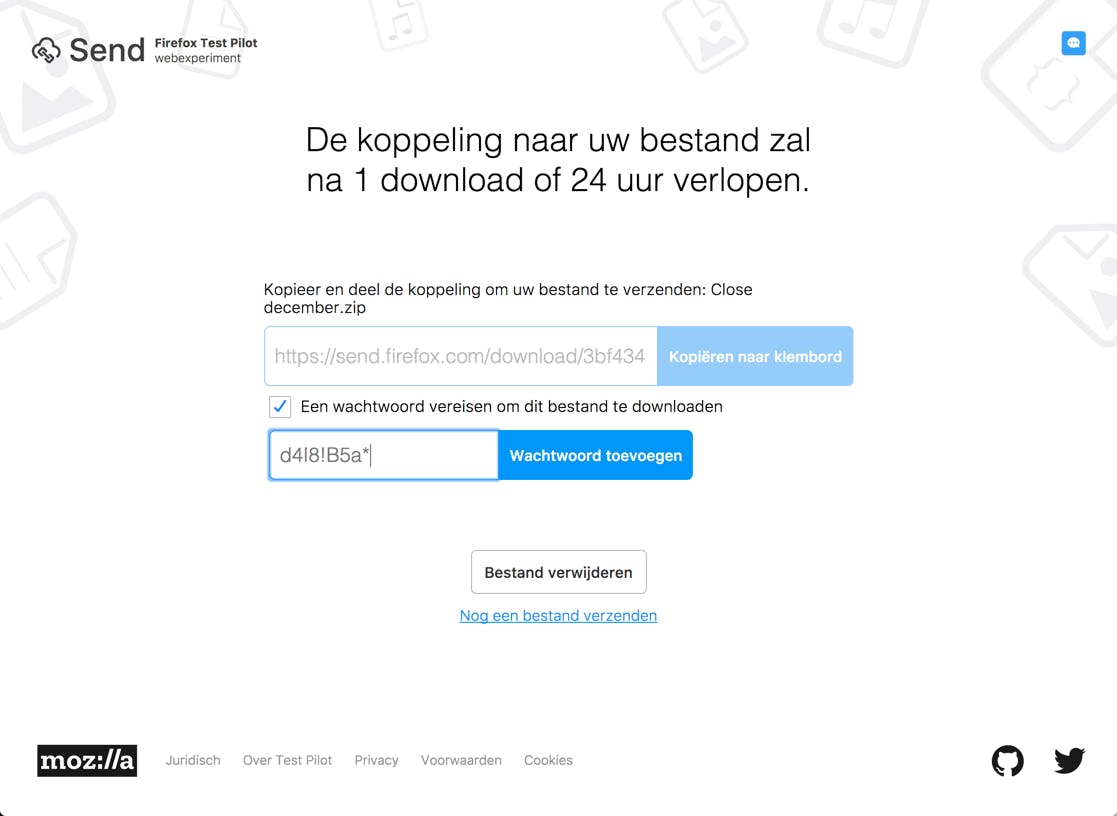 Mozilla claimt met Firefox Send veiligheid hoog in het vaandel te dragen. De bestanden worden immers versleuteld en verwijderd na één download. Mozilla zou naar eigen zeggen alleen je ip-adres kunnen zien. Wil je toch nog een wachtwoord op je bestanden zetten? Dat kan. Vink dan na het uploaden Een wachtwoord vereisen om dit bestand te downloaden aan en typ een zelfgekozen wachtwoord in. Bevestig met Wachtwoord toevoegen. Zodra je terugkeert naar de homepage, krijg je een overzicht van de bestanden die je geüpload hebt en wanneer de koppelingen verlopen. Met de knop met het kruisje kun je nog niet gedownloade bestanden handmatig verwijderen.