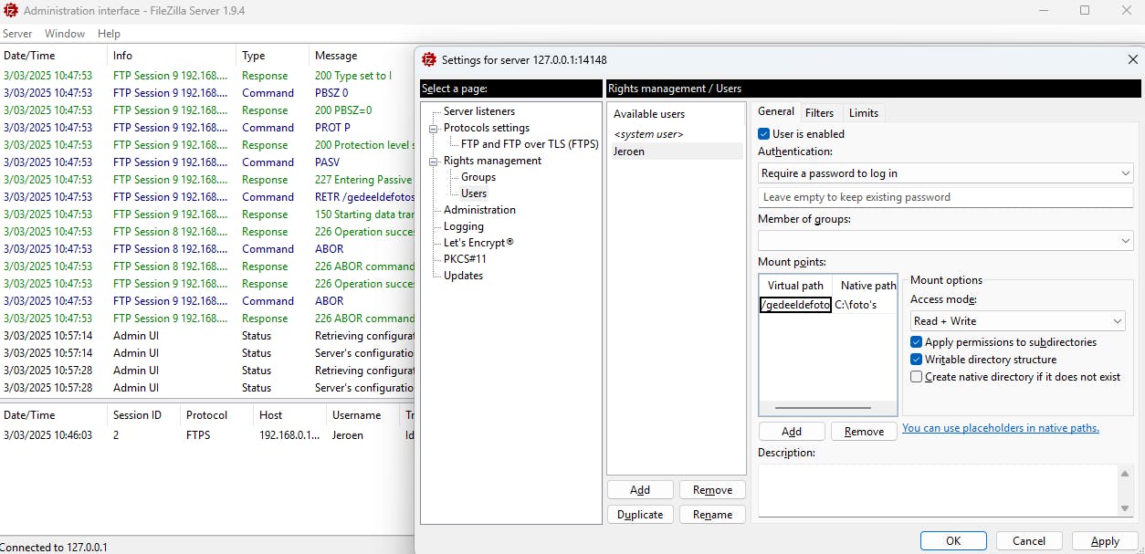 Ga naar Server / Configure en voeg onder Users via Add een nieuwe gebruiker toe, bij voorkeur met een wachtwoord. Bij Mount points klik je op Add, stel je bij Native path de map in die je wilt delen (bijvoorbeeld C:\fotos) en geef je bij Virtual path een duidelijke naam (bijvoorbeeld /gedeeldefotos). Kies bij Access Mode voor Read only of Read+Write en bevestig met OK.