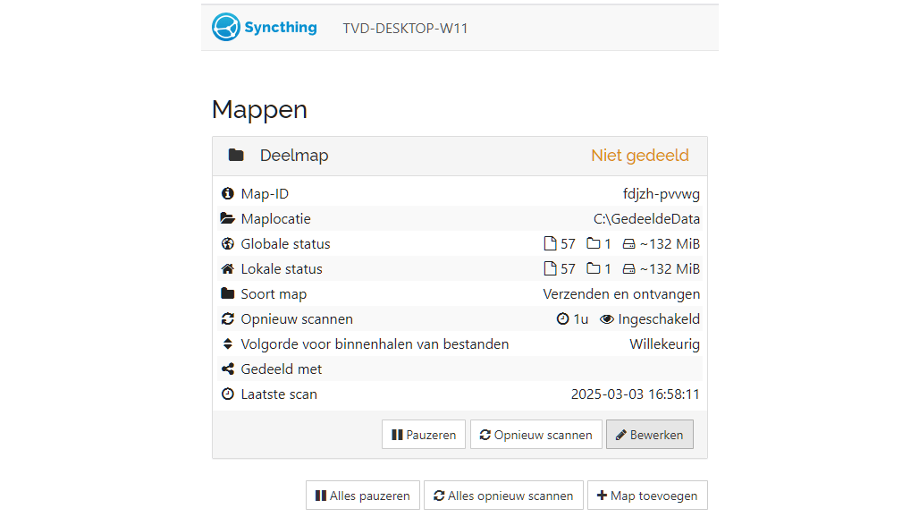 In het hoofdvenster selecteer je een map om via Syncthing met andere apparaten te delen. Klik op +Map toevoegen, vul een naam in bij Maplabel, kies een Map-ID en geef bij Maplocatie het pad op, zoals C:\GedeeldeData. Bevestig met Opslaan. Klik op de toegevoegde map voor details. Gebruik Bewerken voor aanpassingen of om de map eventueel te verwijderen.