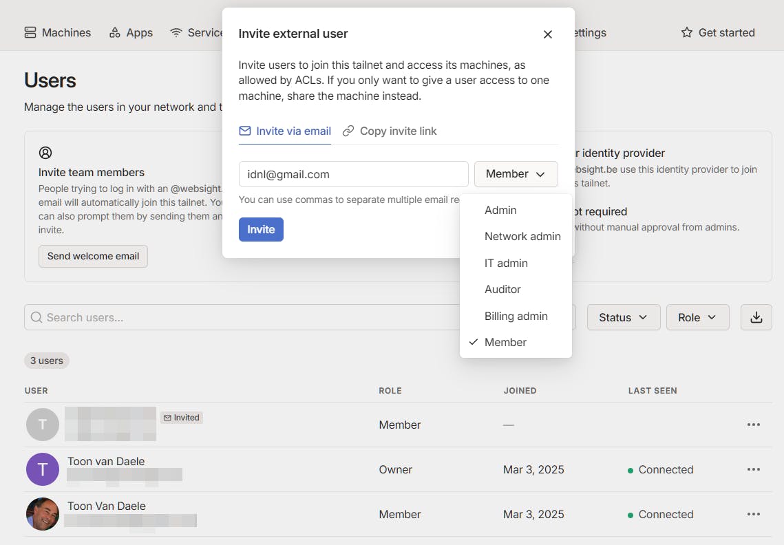 Wil je apparaten van andere gebruikers tijdelijk toegang geven tot je VPN-netwerk zonder je eigen inloggegevens te delen, ga dan naar het dashboard op de site en open Users. Klik op Invite external users en vul het e-mailadres van de ontvanger in. Standaard wordt deze als Member toegevoegd, maar je kunt bijvoorbeeld ook Admin selecteren.