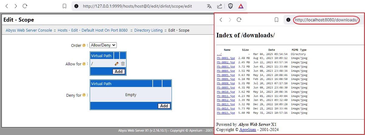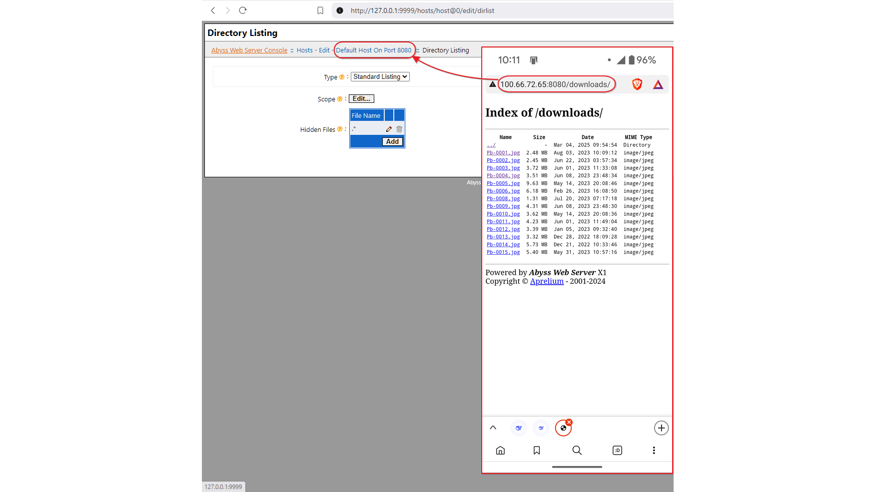 Stel nu dat je op je apparaat een server op poort 8080 hebt draaien (zoals Abyss Webserver), dan kun je deze via Tailscale voortaan makkelijk extern bereiken. Vul in je browser het Tailscale ip-adres van dat apparaat in, gevolgd door het poortnummer, bijvoorbeeld 100.66.72.65:8080. Alle datatransfers van en naar die server verlopen nu veilig binnen de VPN-tunnel van Tailscale.