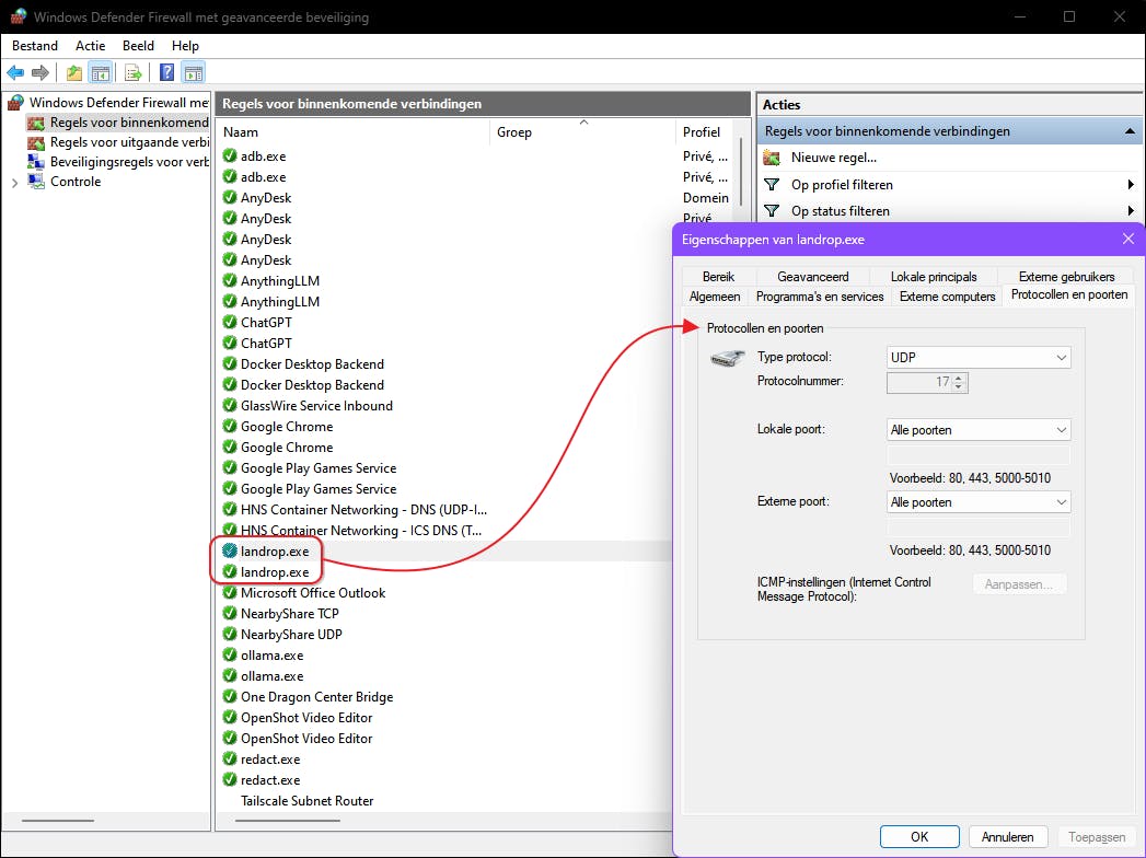 Open de app Windows Defender Firewall met geavanceerde beveiliging en ga naar Regels voor binnenkomend verkeer. Als je tijdens de installatie van bijvoorbeeld LANDrop toestemming gaf, zijn er standaard twee regels met landrop.exe aangemaakt. Onder Eigenschappen zie je op het tabblad Protocollen en poorten dat alle poorten openstaan, één regel voor TCP en één regel voor UDP.