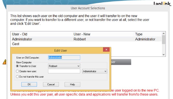 Start PCmover Express en klik op Next. Selecteer PC to PC Transfer en ga verder. Kies Windows 7 / Windows 8 en klik op Next. Kies WiFi or Wired Network en kies Next. Kijk of de naam van de oude pc achter Network Name staat, zo niet: klik op Browse en zoek de computer op. Klik op User Account Selections, selecteer het account en klik op Edit User.