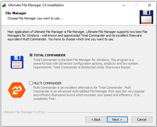 Wij gaan voor de lite-versie, want ons is het vooral te doen om het Verkenner-alternatief. Wanneer de installer start, moet je weer door een negental keuzeschermen ploeteren. Wil je de normale installatie of wil je de draagbare versie om de software vanaf een usb-stick te laten werken? Daarna vraagt de installer welke filemanager je wilt installeren. Je hebt de keuze uit Total Commander of Multi Commander. De eerste mag je een maand gratis gebruiken, daarna moet je de creditcard trekken. Wij kiezen voor Multi Commander die nagenoeg op dezelfde manier werkt, maar gratis is.