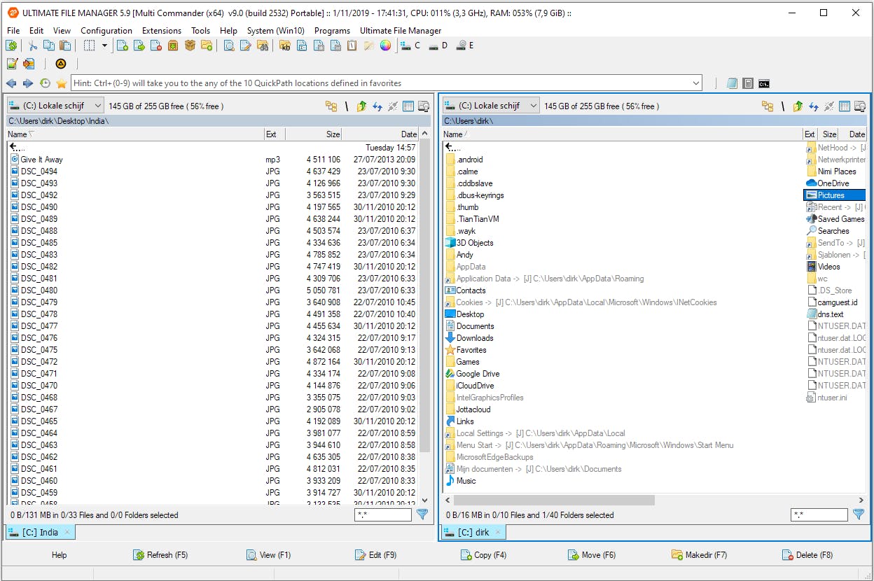 Via het uitklapmenu linksboven bij iedere helft bereik je met één muisklik de verschillende schijfstations en ook de bibliotheken. Net als in Windows Verkenner is dit de snelste weg naar mappen als Documenten, Downloads, Afbeeldingen, Muziek … Ook clouddrives als Dropbox, OneDrive, Google Drive bevinden zich in de lijst. Administrators kunnen langs deze weg zelfs naar het Windows-register of naar een locatie op het ftp-netwerk. Onderaan is de statusbalk. Wanneer je een map of bestand hebt geselecteerd vind je in de statusbalk de knoppen om het bestand te bekijken, de inhoudsweergave van de map te verversen, bestanden te kopiëren, te verplaatsen of te verwijderen. In deze balk volg je trouwens ook de voortgangstatus van de bewerkingen die je uitvoert.