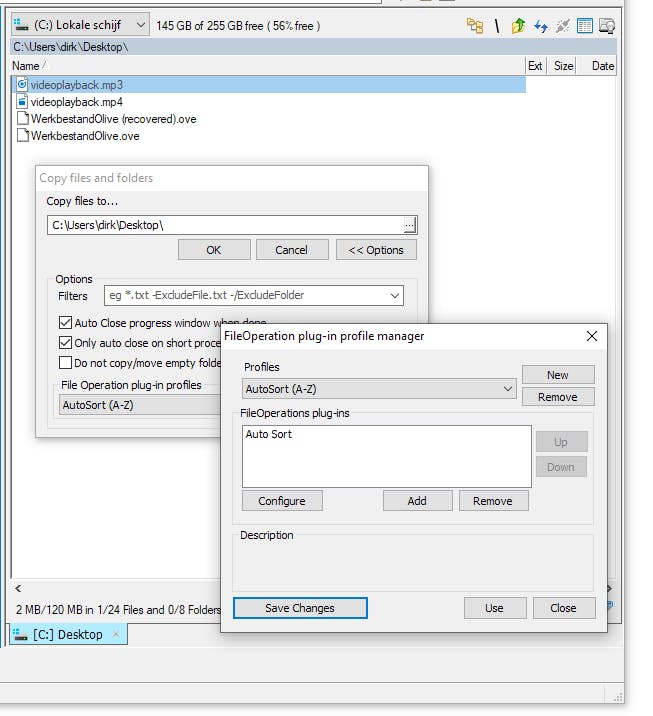 Om een map of een bestand van A naar B te kopiëren druk je de Ctrl-toets in en je sleept de map of het bestand vanuit de ene vensterhelft naar de andere. Hierdoor opent zich een klein venstertje waar je eventueel een andere locatie kunt selecteren en waar je een bestandsbewerking toepast via zogenaamde plug-in-profielen. Zo kun je bijvoorbeeld Unpacker inschakelen om rar- en zip-bestanden uit te pakken.