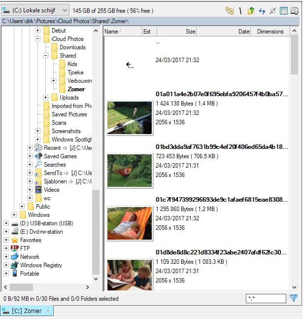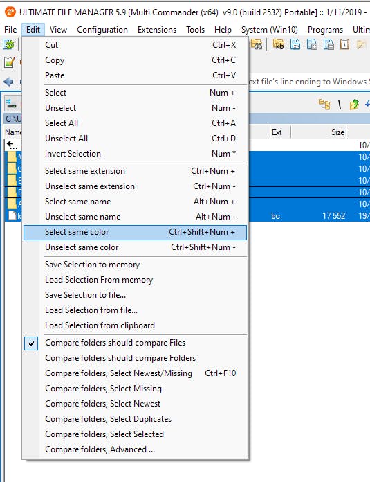 Wanneer je een bestand hebt geselecteerd in zo’n vensterhelft kun je de selectie makkelijk uitbreiden via het menu Edit / Select same extension of Select same name of Select same color. Denk je dat je dezelfde selectie later nog voor een andere bewerking zult nodig hebben, dan kun je de selectie opslaan met Edit / Save Selection to file. Om daarna deze selectie opnieuw te laden volg je Edit / Load Selection to file. Op die manier kun je alle vroegere selecties op ieder moment opnieuw oproepen.