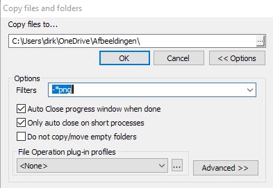 Bij het verplaatsen en het kopiëren zijn de filters erg nuttig, vooral wanneer het gaat om een groot aantal bestanden. In het venstertje dat verschijnt kun je namelijk inclusie- en exclusiefilters vastleggen. Wil je in een filter verwijzen naar een bepaalde map dan typ je voor de naam van de map een schuine streep /. Wanneer je een map van een verplaats- of kopieeropdracht wilt uitsluiten, gebruik je het minteken -. Bijvoorbeeld met -/VakantieNoorwegen sluit je de map VakantieNoorwegen uit. Om naar bestanden te verwijzen gebruik je het sterretje *. Wil je bijvoorbeeld alle jpg-bestanden in een bepaalde directory kopiëren dan gebruik je *.jpg. Met -*jpg kopieer of verplaats je juist geen jpg-bestanden. Wil je alle bestanden *.* kopiëren behalve de map Rome en mp3-bestanden dan ziet het filter er als volgt uit *.*-/Rome-*.mp3. Om alle .xlsx-bestanden te verplaatsen behalve degene waarvan de naam begint met 2019, dan gebruik je het filter *.xlsx-2019*.