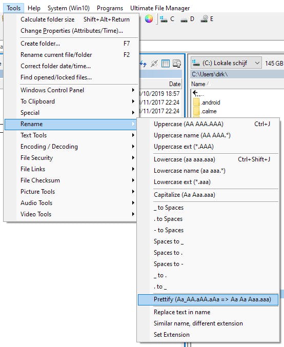Zijn de namen van je bestanden en mappen een rommeltje van hoofdletters en kleine letters met en zonder spaties en underscores (laag liggende streepjes)? Bij de Tools onder Rename zitten de functies om orde in de chaos te scheppen en alles er consistent te laten uitzien. Je kunt bijvoorbeeld de underscores omzetten in spaties, of punten, of andersom. Het is ook mogelijk om de extensies van bestanden aan te passen of een bepaalde tekstcombinatie in de namen te wijzigen. Hou je helemaal niet van underscores, punten of koppeltekens in de namen van bestanden en mappen dan is er de functie Prettify die deze er deze map/bestandsnamen omzet in toegankelijker stijl.
