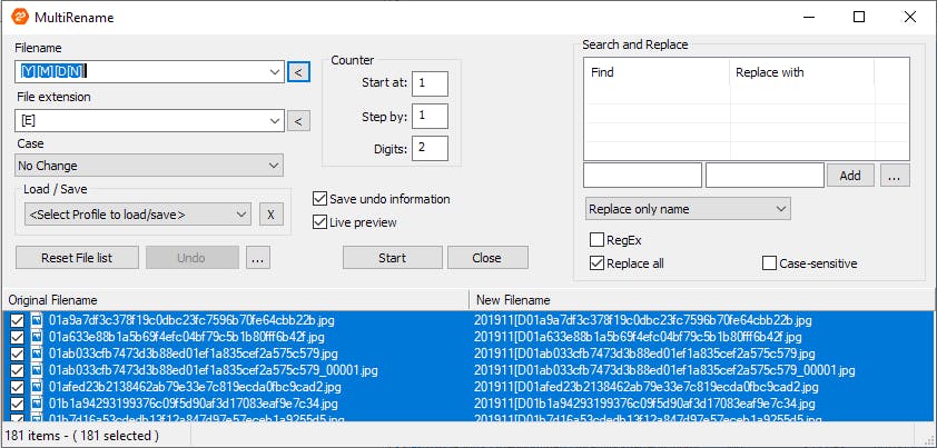 Om een heleboel bestanden in een map te hernoemen gebruik je via Extensions de opdracht MultiRename. Hiermee selecteer je een deel van de bestandsnaam, voeg je tekst of tekens toe en vervang je woorden door middel van regels die je zorgvuldig samenstelt. In hetzelfde venster kun je de bestandseigenschappen van de volledige selectie aanpassen. De nietszeggende namen van fotobestanden kun je hier laten vervangen door bijvoorbeeld de opnamedatum gevolgd door een nummer. Wanneer je meerdere keren dezelfde MultiRename-opdracht uitvoert, kun je die regels opslaan voor later gebruik.