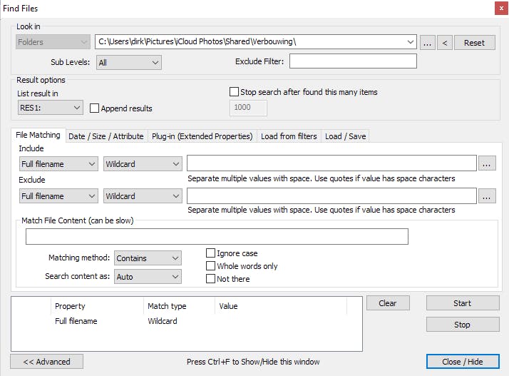 Om niet overspoeld te worden door resultaten kun je opgeven hoeveel subniveaus omlaag in de bestandshiërarchie deze tool moet zoeken. Ten slotte is het mogelijk om in de inhoud van bestanden te zoeken naar één of meerdere woorden. In dat geval typ je in het vak Match File Content de tekst die je in een bestand zoekt.