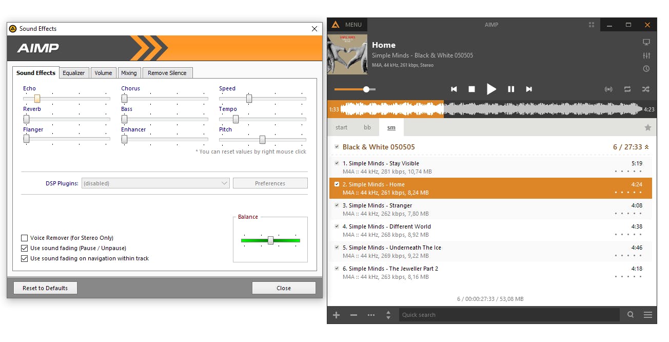 De applicaties die je tijdens de installatie van Ultimate File Manager hebt toegevoegd staan ook bovenaan bij de knoppen. In de Lite Versie zijn dat er dus drie. AIMP is een freeware-audioplayer die heel weinig geheugen gebruikt en die verschillende skins en visualisaties ondersteunt. De tool haalt de albumhoezen op en je kunt ook naar internetradio luisteren. Deze lichtgewicht player ondersteunt automatische volumecontrole en in het tabblad Sound Effects kun je bijvoorbeeld de stem uit songs weghalen, extra bas toevoegen, het tempo en de snelheid aanpassen.
